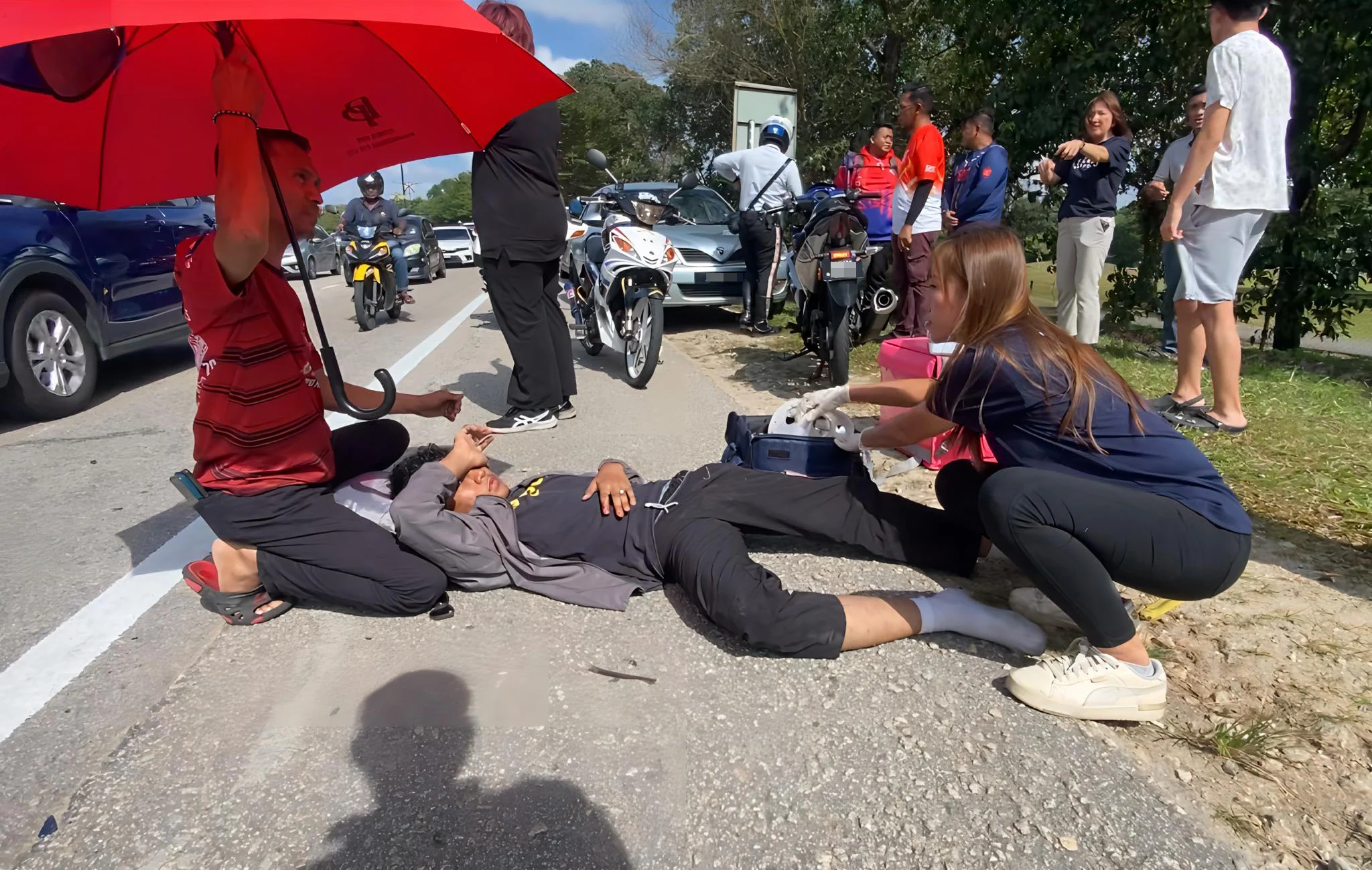 据了解,这名约20岁的巫裔青年与家人居住在马赛城,趁着假期当送餐员赚取额外收入。不幸的是,他在繁忙路段发生车祸,倒卧在地,其父亲第一时间赶到,看着儿子受伤的模样,满脸担忧。